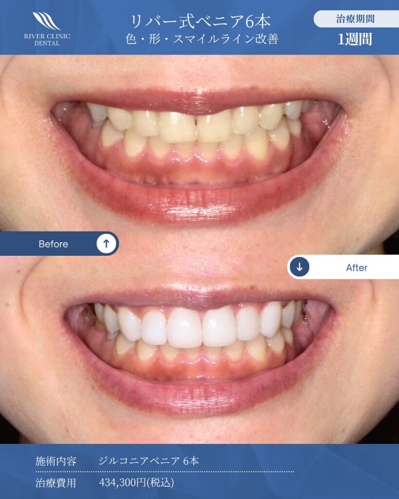 リバー式ベニア(ラミネートベニア)とは、天然の歯に近いセラミックの薄いシェルを貼り付け、見た目の改善を治療する方法です。 例えて言うなら付け爪のようなイメージですが、強力に歯と接着させるため、付け爪ほど取れやすいものではなく、派手な物というより自然な歯の風合いに近づける治療となります。 リバー式ベニア(ラミネートベニア)で改善出来るお悩みは、歯の形や色、小さな歯並びの問題などで、歯をほとんど削らないため侵襲が少なく、樹脂による治療に比べ劣化しにくい審美治療となります。 歯の表面をわずかに削るケース、全く削らないケースから選択が可能で、2回の通院で治療が完了いたします。