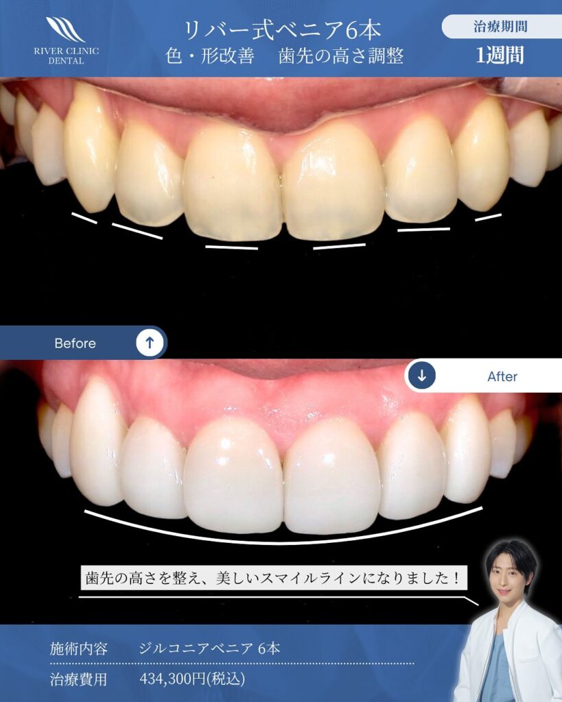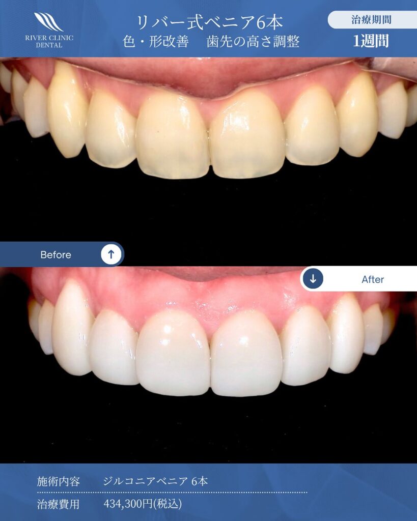 リバー式ベニア(ラミネートベニア)とは、天然の歯に近いセラミックの薄いシェルを貼り付け、見た目の改善を治療する方法です。 例えて言うなら付け爪のようなイメージですが、強力に歯と接着させるため、付け爪ほど取れやすいものではなく、派手な物というより自然な歯の風合いに近づける治療となります。 リバー式ベニア(ラミネートベニア)で改善出来るお悩みは、歯の形や色、小さな歯並びの問題などで、歯をほとんど削らないため侵襲が少なく、樹脂による治療に比べ劣化しにくい審美治療となります。 歯の表面をわずかに削るケース、全く削らないケースから選択が可能で、2回の通院で治療が完了いたします。