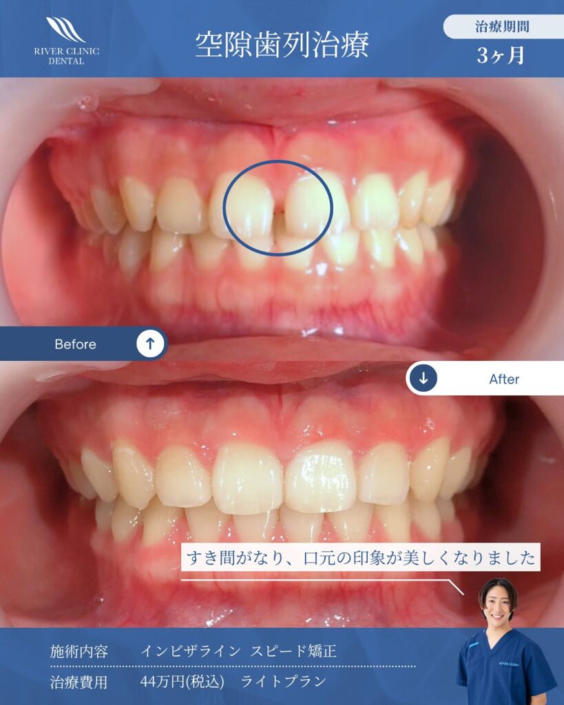 上唇小帯の切除とインビザラインを組み合わせることで、すきっ歯を効果的に治療できた症例です。治療完了後は後戻りを防ぐためのリテーナー装着を継続していただいています。