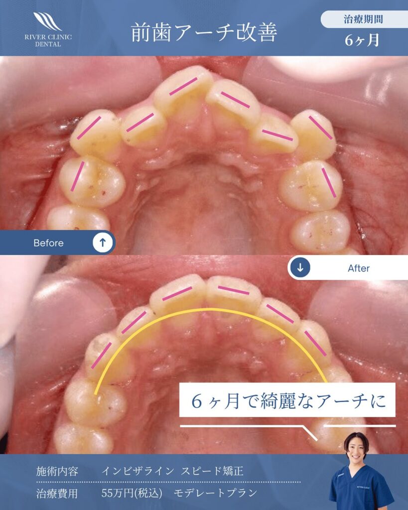 矯正治療によって前歯を後方へ移動させることが可能です。これにより、横顔のバランスが改善し、理想的なEラインに近づきます。
