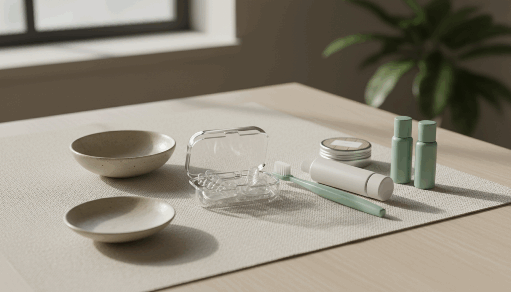 また、外出先での簡易クリーニング用に、**アルコールフリーのウェットティッシュ**や**マウスピース用洗浄シート**も持参すると便利です。