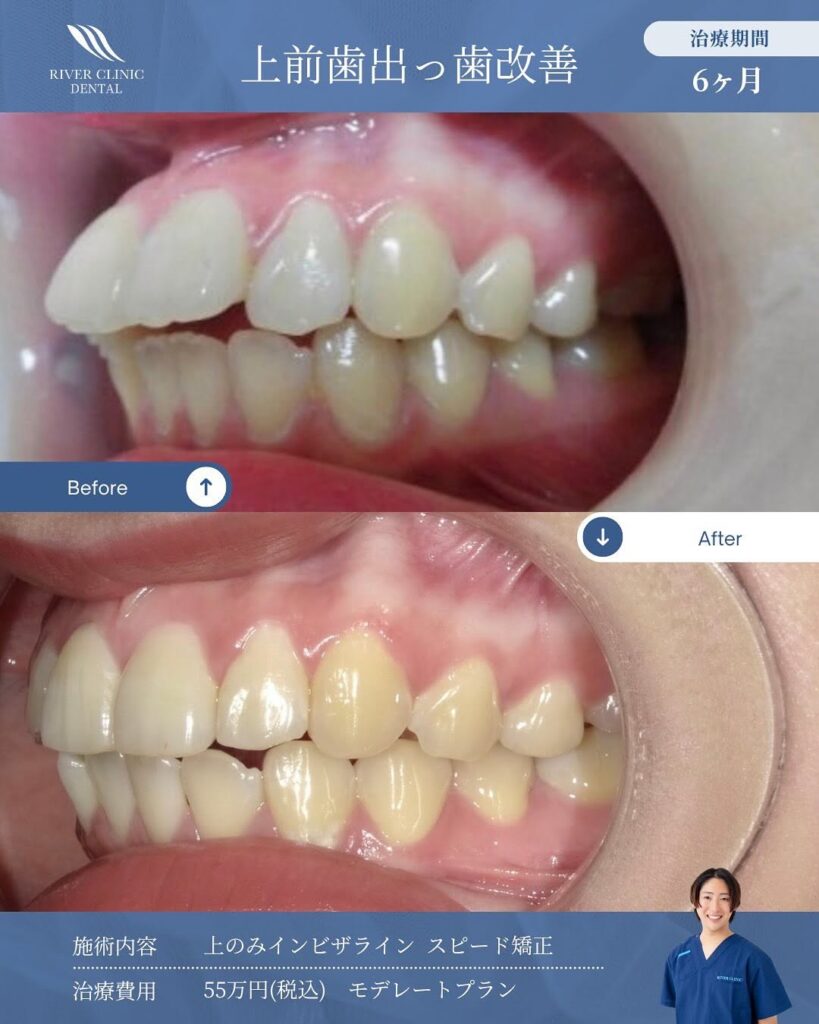 治療後は、八重歯が改善されただけでなく、全体的な歯列のバランスも整いました。患者様からは「もっと早く治療を始めればよかった」というお声をいただきました。
